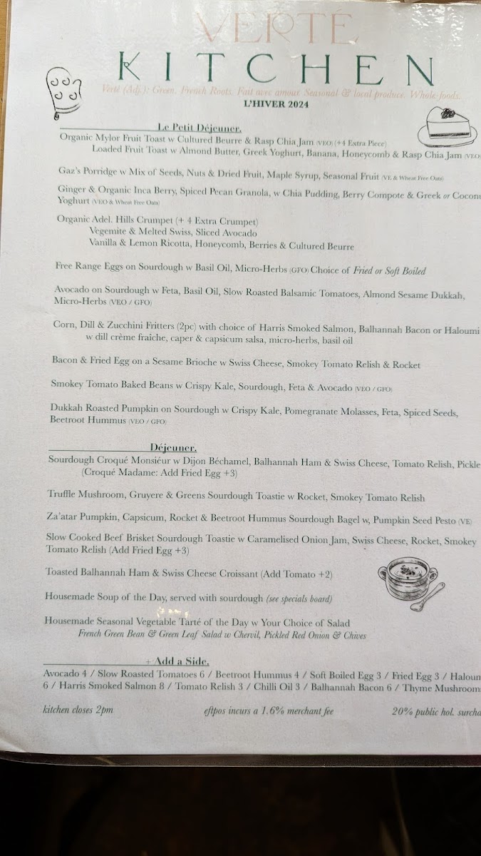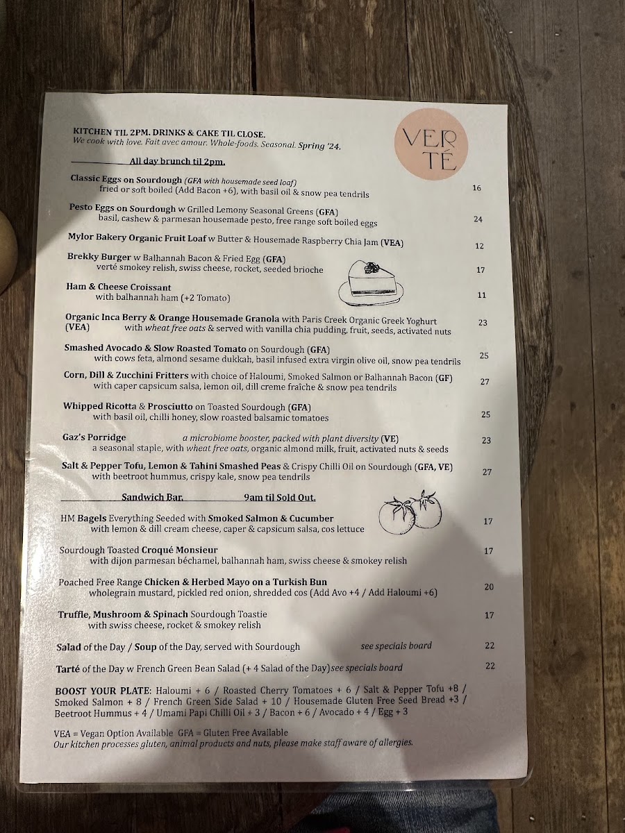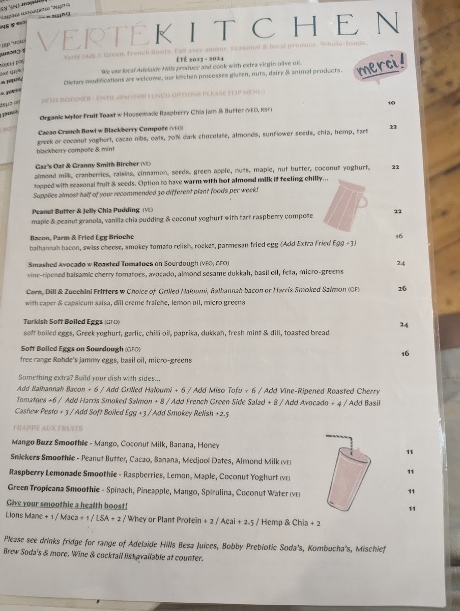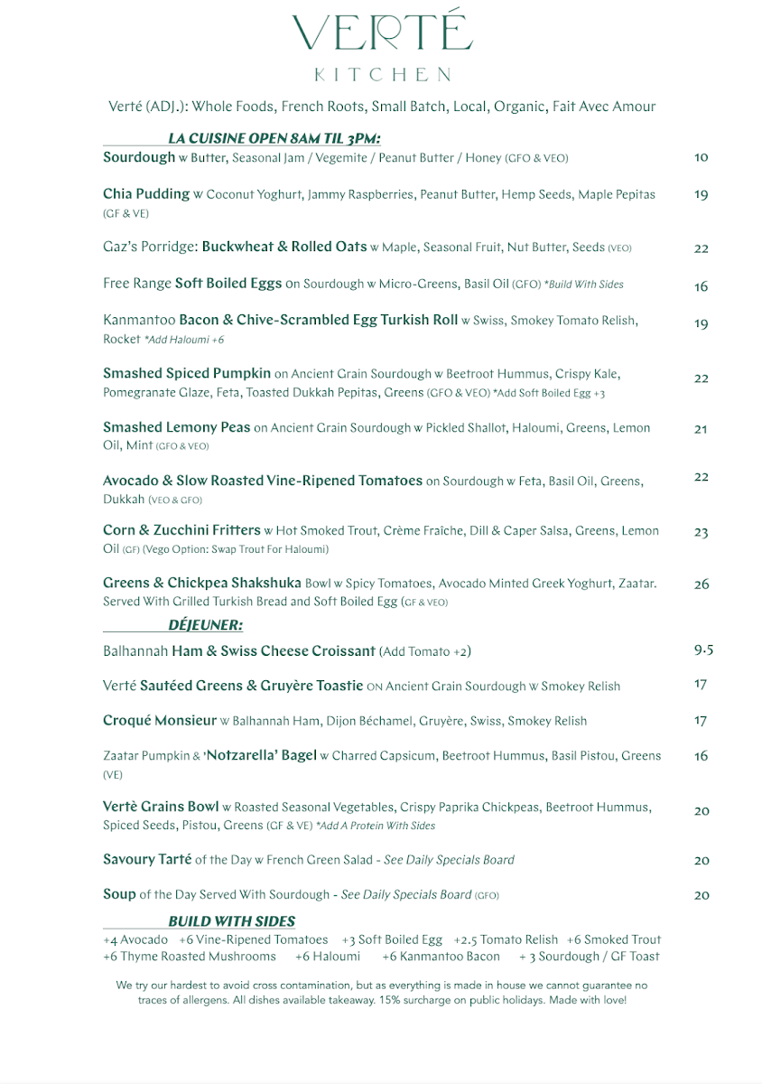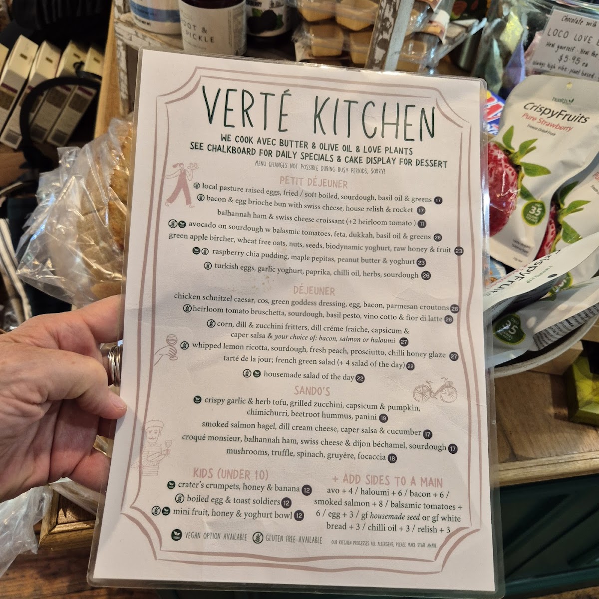 Verté Kitchen offers a delightful selection of dishes that cater to various tastes, making it a perfect spot for any time of day. For breakfast, the menu features options like Local Pasture Raised Eggs, available fried or soft-boiled, served with Sourdough, Basil Oil & Greens; the Bacon & Egg Brioche Bun with Swiss Cheese and house relish is another tempting choice. If you're after something lighter, the Avocado on Sourdough with balsamic tomatoes, feta, dukkah, and basil oil is a fresh option. For those craving something sweet, the Green Apple Bircher with biodynamic yogurt, raw honey, and fruit provides a satisfying and wholesome start. Lunch options like the Chicken Schnitzel Caesar and Heirloom Tomato Bruschetta with basil pesto and fior di latte bring bold flavors to the table, while the Corn, Dill & Zucchini Fritters with your choice of bacon, salmon, or haloumi is a crowd-pleaser. Sando lovers will enjoy the Crispy Garlic & Herb Tofu or the classic Croqué Monsieur with ham, Swiss cheese, and Dijon béchamel. For the younger crowd, Crater's Crumpets with honey and banana or Boiled Egg & Toast Soldiers are ideal picks. To accompany your meal, the café serves expertly brewed coffee, including Espresso and Flat White, as well as refreshing smoothies like Mango Buzz and Berry Lemonade. Organic teas such as English Breakfast and Adaptogenic Chai offer a relaxing beverage option. Whether it's an indulgent breakfast or a savory lunch, Verté Kitchen’s menu provides something for every palate in a cozy, inviting atmosphere.
