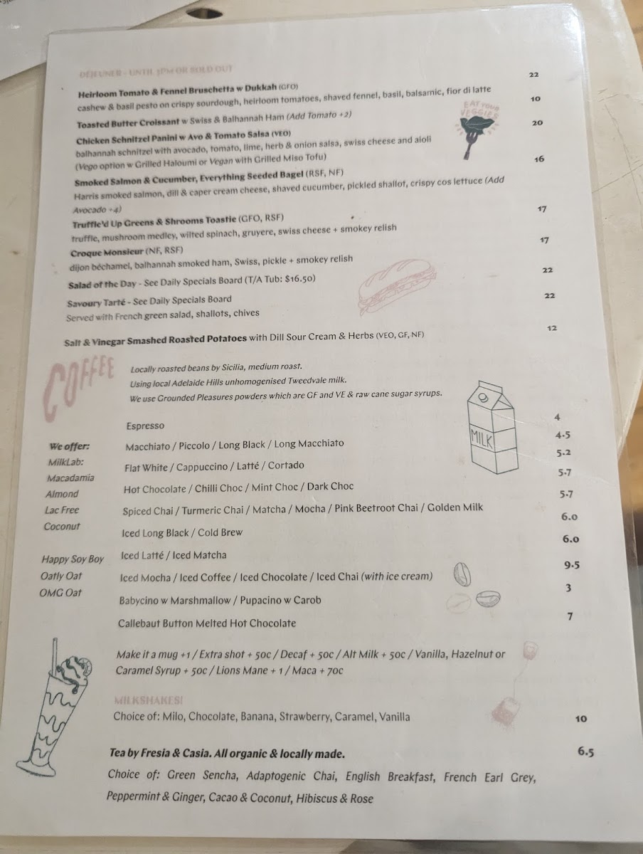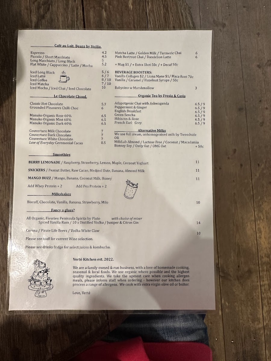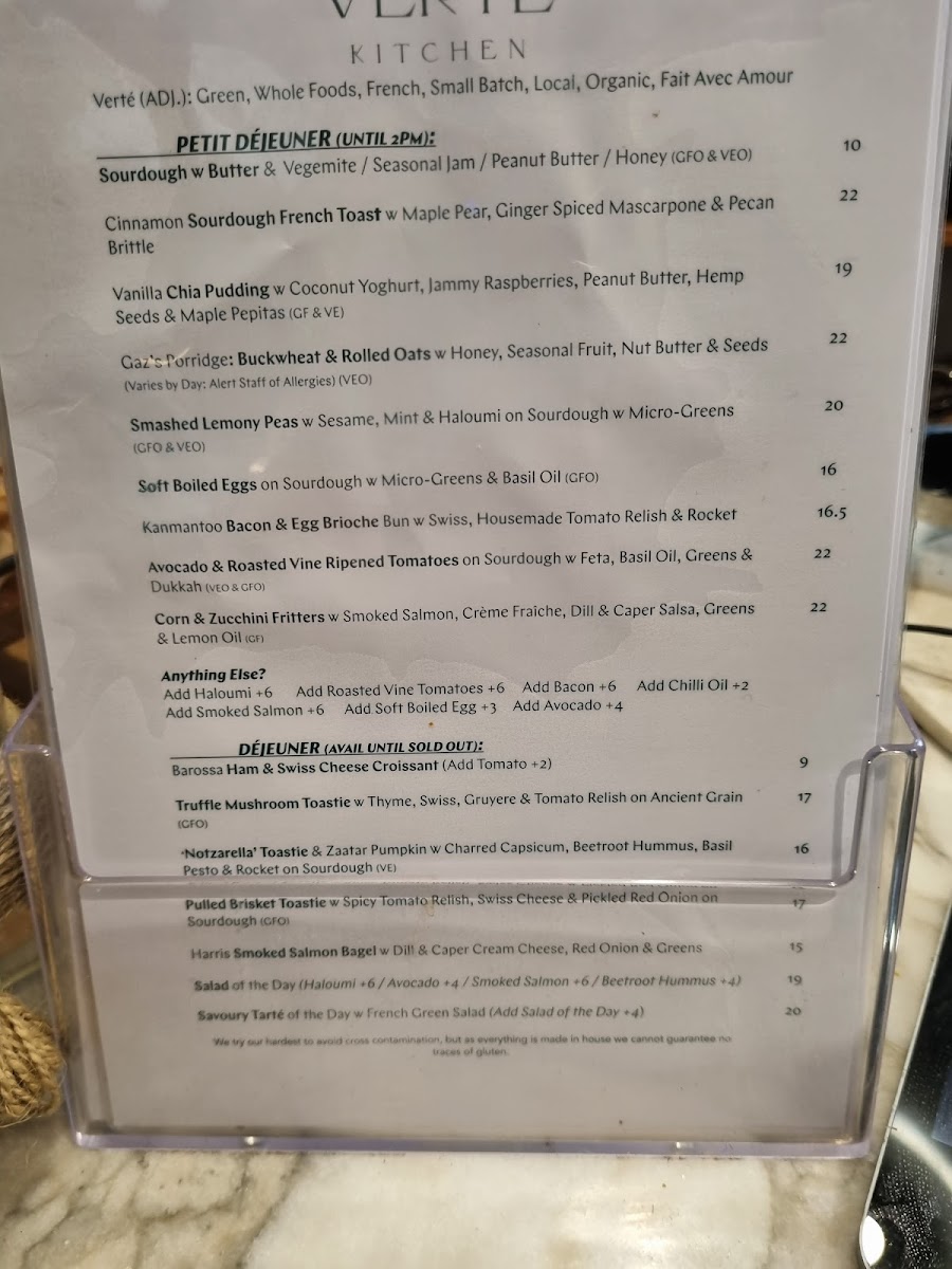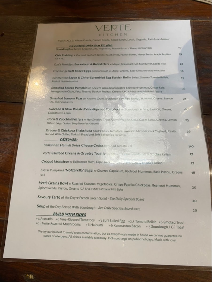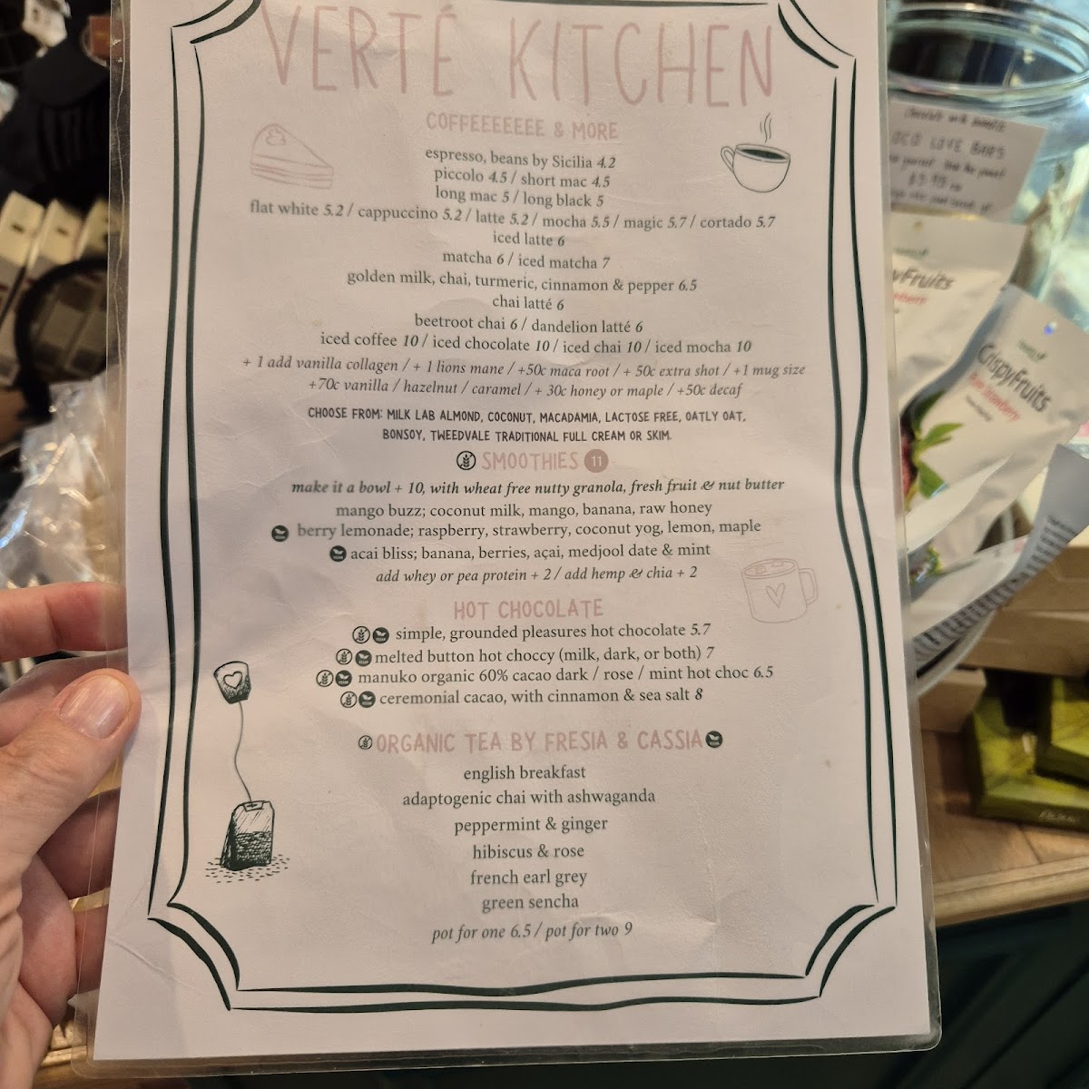 Verté Kitchen offers a delightful selection of dishes that cater to various tastes, making it a perfect spot for any time of day. For breakfast, the menu features options like Local Pasture Raised Eggs, available fried or soft-boiled, served with Sourdough, Basil Oil & Greens; the Bacon & Egg Brioche Bun with Swiss Cheese and house relish is another tempting choice. If you're after something lighter, the Avocado on Sourdough with balsamic tomatoes, feta, dukkah, and basil oil is a fresh option. For those craving something sweet, the Green Apple Bircher with biodynamic yogurt, raw honey, and fruit provides a satisfying and wholesome start. Lunch options like the Chicken Schnitzel Caesar and Heirloom Tomato Bruschetta with basil pesto and fior di latte bring bold flavors to the table, while the Corn, Dill & Zucchini Fritters with your choice of bacon, salmon, or haloumi is a crowd-pleaser. Sando lovers will enjoy the Crispy Garlic & Herb Tofu or the classic Croqué Monsieur with ham, Swiss cheese, and Dijon béchamel. For the younger crowd, Crater's Crumpets with honey and banana or Boiled Egg & Toast Soldiers are ideal picks. To accompany your meal, the café serves expertly brewed coffee, including Espresso and Flat White, as well as refreshing smoothies like Mango Buzz and Berry Lemonade. Organic teas such as English Breakfast and Adaptogenic Chai offer a relaxing beverage option. Whether it's an indulgent breakfast or a savory lunch, Verté Kitchen’s menu provides something for every palate in a cozy, inviting atmosphere.